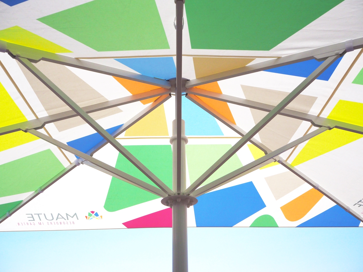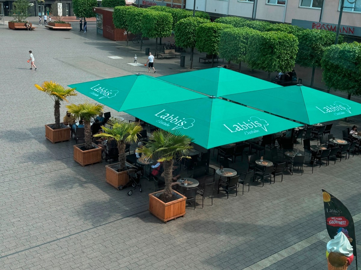 Unsere Großschirme bieten ideale Flächen für aufmerksamkeitsstarke Werbebotschaften.