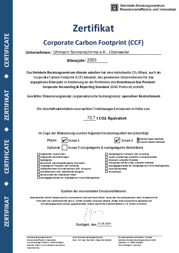 Wir von Uhlmann Sonnenschirme sind uns unserer Verantwortung für Umwelt, Menschen und Gesellschaft bewusst.
